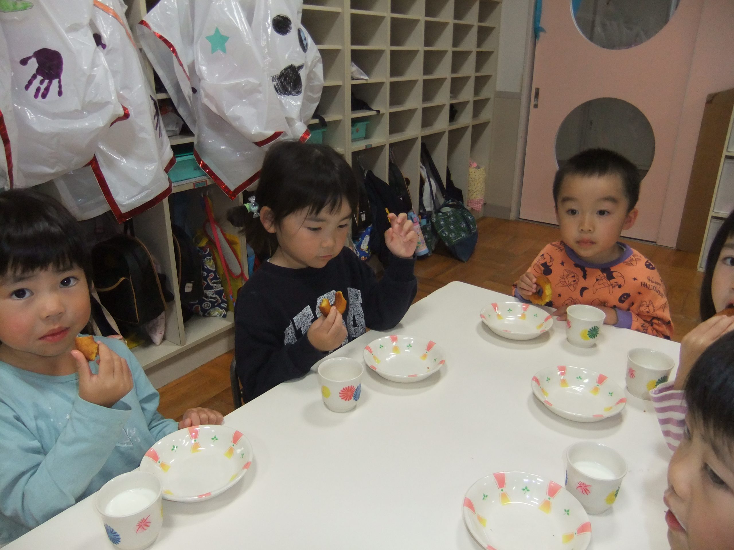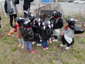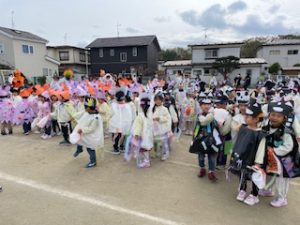 ハロウィンパーティー 2025年10月31日 イベント 幼稚園のハロウィンパーティーの様子です。仮装をしてパレードをしました。 近くの公園でお菓子をもらったよ! 今日のおやつは、手作りのかぼちゃドーナツでした。 おいしかったね!