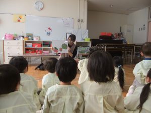 もぐもぐきっずの会 2025年11月21日 イベント いずみ保育園分園てってらんどから栄養士の先生が来てくれました。 りんご組の子ども達に秋の食べ物のお話をしてくれました。 本物の果物や野菜を触ってみました。 たくさん食べて、元気に遊ぼうね!